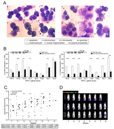 Evaluating the effects of combined therapy with CEL, AZA, and AM155. (A) Cytology staining via standard May–Grünwald–Giemsa-Romanowski protocol after exposing the hAML cell line NB4 (left) and OCI-M2 cell line (right) for 72 h to 0.4 μM AZA, 0.4 μM CEL, and 4 μM AM155 (b–f) compared to uniform myeloblasts or proerythroblasts respectively seen in untreated (a) controls. (B) DNA methylation of hPU.1 genes, untreated (empty) or treated for 72 h with 0.4 μM AZA, 0.4 μM CEL, and 4 μM AM155 (dark). Methyl DNA IP assay (MagMeDIP), y-axis = %methylation; x-axis = DNA loci. Unpaired two-tailed Student’s t-test was used. Error bars represent standard deviations. (C) Analysis of luciferase activity in mice treated with either 3-drug combination or a vehicle; see Section 2.3. Mean is shown, unpaired Mann–Whitney t-test. Table below provides AVG and SEM values; p-values: * p < 0.05, ** p < 0.05, *** p < 0.005. (D) Examples from the 3 experimental groups (y-axis); luminescence weekly under general anesthesia (isoflurane) after i.p. addition of D-luciferin, see Materials and Methods.