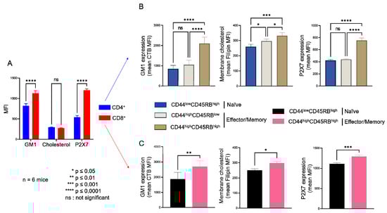 Plasma membrane levels of GM1 gangliosides, cholesterol and P2X7 receptor in T cells at different stages of differentiation. Plasma membrane levels of GM1, cholesterol, and P2X7 were quantified by flow cytometry using FITC-conjugated cholera toxin B subunit (CTB), filipin III, and anti-P2X7 extracellular domain mAb, respectively. Results are presented as the mean MFI values for GM1, cholesterol, and P2X7 in the CD4+ and CD8+ T-cell subpopulations (A) and in CD44lowCD45RBhigh naïve and CD44highCD45RBlow or CD44highCD45RBhigh effector/memory CD4+ (B) and CD8+ (C) T-cell subsets. Data are expressed as the mean of percentages (±SEM, n ≥ 6 mice). Asterisks denote statistically significant differences * p ≤ 0.05; ** p ≤ 0.01; *** p ≤ 0.001 **** p ≤ 0.0001; ns: not significant.