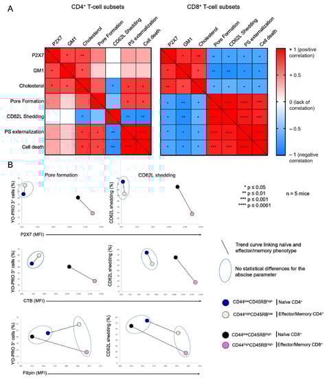 Relationship between the plasma membrane levels of GM1, cholesterol, and P2X7, and cellular responses induced by eATP in T-cell subsets. (A) Pearson correlation matrix showing the degree of correlation between the plasma membrane levels of GM1, cholesterol, and P2X7, pore formation, CD62L shedding, PS externalization and cell death in CD4+ and CD8+ T-cell subpopulations in the presence of 500 µM ATP for 30 min at 37 °C. The magnitude and direction of the correlation coefficient is indicated on a color gradient that varies from +1 (positive correlation) to −1 (negative correlation). White squares indicate the absence of a correlation. Red and blue squares represent positive and negative correlations between two variables, respectively. Statistically significant correlations are denoted by asterisks within squares: * p ≤ 0.05, ** p ≤ 0.01, *** p ≤ 0.001, **** p ≤ 0.0001. (B) Scatter plots showing the phenotypic profile of CD44lowCD45RBhigh naïve and CD44highCD45RBlow or CD44highCD45RBhigh effector/memory T-cell subsets (either CD4+ or CD8+) in terms of the amplitude of ATP-induced pore formation and CD62L shedding (500 µM, 30 min, 37 °C) and the plasma membrane levels of GM1, cholesterol, and P2X7. The T-cell subsets that were non-statistically different for the abscissa parameter (either GM1, cholesterol, or P2X7 expression) are surrounded by a blue ellipse. The black dotted line links the naïve subset (either CD4+ or CD8+) with its effector/memory counterpart. Data are expressed as the mean of percentages (n ≥ 5 mice).