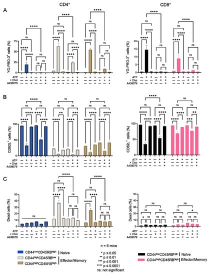 Assays for P2X7-induced CD62L shedding, phosphatidylserine (PS) externalization, and pore formation were performed as previously described [,,,]. Briefly, splenocytes (106 cells/mL) suspended in RPMI 1640 culture medium were stimulated with 500 µM eATP in a humidified 5% CO2 atmosphere at 37 °C for 30 min. Then, cells suspensions were washed and labelled for 30 min on ice with phenotype-specific fluorescent mAbs and fluorescent-conjugated anti-CD62L mAb, and Annexin V fluorescent probe to assess CD62L shedding and PS externalization. To measure P2X7-mediated pore formation, eATP stimulation was performed in the presence of YO-PRO-3 fluorescent dye (Thermo Fisher Scientific). In certain experiments, cells were pre-treated with 10 µM of the competitive P2X7 antagonist A438079 for 20 min before treatment with eATP. Data acquisition was performed at the Flow Cytometry Core Facility at IPSIT (Clamart, France). Flow cytometry data were analyzed using FlowJo v10.8.1 (BD, Ashland, OR, USA) software.