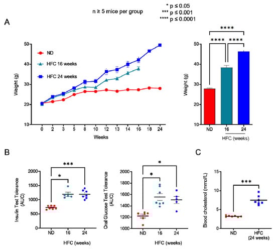 Mice were either fed a normal diet (ND) or a high fat diet (34% lard, 8.3% saturated fatty acids, 4.5% mono-unsaturated fatty acid and 5.8% poly-unsaturated fatty acids) supplemented with 1% cholesterol (HFC) (Ssniff, Soest, Germany) []. All diets were supplied ad libitum for 16 to 24 weeks. The weight of the mice was monitored every week.