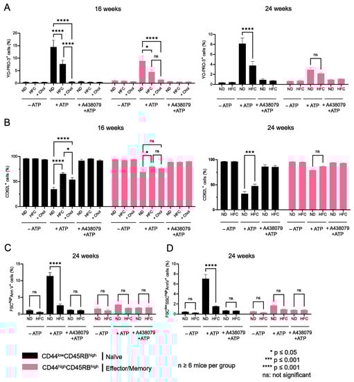 Diet-induced hypercholesterolemia affects P2X7-induced cellular responses in naive and effector/memory CD8+ T cells. Following stimulation with 500 µM eATP for 30 min at 37 °C with or without pre-treatment with 10 µM of the P2X7 antagonist A438079 (+A438079), P2X7-dependent pore formation (A), CD62L shedding (B), reversible PS externalization in living cells (FSChighAnnV+) (C), and cell death characterized by irreversible PS externalisation (FSClowSSChighAnnV+) (D) were evaluated in CD44lowCD45RBhigh naive and CD44highCD45RBhigh effector/memory CD8+ T cells from mice fed either a normal diet (ND) or a high-fat diet (HFC) maintained for 16 (left panel) or 24 weeks (right panel). Splenocytes from mice fed a normal diet were treated with MBCD/Chol complexes (+Chol) ex vivo as a positive control for cholesterol enrichment. Data are expressed as the mean of percentages (±SEM, n ≥ 6 mice). Asterisks denote statistically significant differences * p ≤ 0.05, *** p ≤ 0.001, **** p ≤ 0.0001, ns: not significant.