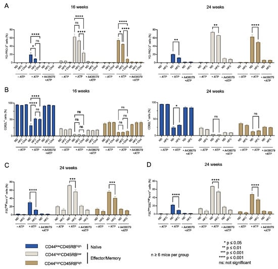 2.4. Diet-Induced Hypercholesterolemia Affected P2X7-Induced Cellular Responses in Naive and Effector/Memory CD4+ and CD8+ T Cells