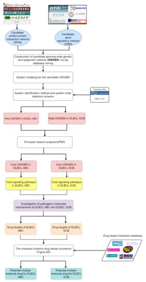 The DLBCL microarray data is from the National Center for Biotechnology Information (NCBI) with accession number GSE117556. The corresponding platform is GPL14951. The dataset samples were divided into two subtypes, DLBCL ABC and DLBCL GCB, in which the ABC subtype has worse prognosis. There are 468 samples and 249 samples for DLBCL GCB and DLBCL ABC, respectively. The flowchart of systems drug discovery is in Figure 1. For identifying essential biomarkers as drug targets to alleviate DLBCL ABC and DLBCL GCB, we investigated the pathogenic molecular mechanisms based on the systems biology methods: (1) big database mining; (2) system modeling; (3) system identification and system order detection scheme; (4) principal network projection method.