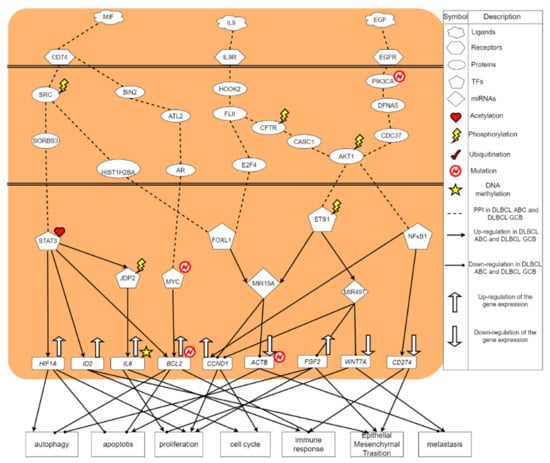 From the core signaling pathways of DLBCL ABC in Figure 2, macrophage migration inhibitory factor (MIF) is found to be an important regulator of the innate immune system. MIF is classified as a pro-inflammatory cytokine []. MIF binds to CD74 on other immune cells to trigger an acute immune response []. Receptor CD74 (HLA class II histocompatibility antigen γ-chain receptor) in DLBCL ABC receives microenvironment factor MIF (macrophage migration inhibitory factor) to regulate TF STAT3 and MYC [], respectively. The signaling transduction protein SRC, which was affected by phosphorylation, could transmit signals from CD74 to TF STAT3 in DLBCL ABC. Moreover, SRC was phosphorylated at the specific tyrosine residue by other tyrosine kinases, playing an important role in regulating embryonic development and cell growth []. Another signaling transduction protein, SORBS3, encodes a SH3 domain-containing adaptor protein. The presence of the SH3 domain is responsible for making the protein bind other cytoplasmic molecules, which are helpful for cytoskeletal organization, cell migration, gene expression and signaling. The constitutive activation of STAT3 signal promotes the growth, survival, angiogenesis and metastasis of tumor cells []; the overexpression of abnormally acetylated (activated) TF STAT3 can upregulate its target gene HIF1A [], thereby promoting cellular functions, including cell proliferation as well as autophagy and inhibiting apoptosis []. At the same time, TF STAT3 would upregulate the target gene ID2 [] resulting in the promotion of cell cycle and epithelial-mesenchymal transition (EMT). Besides, it would upregulate the target gene BCL2, triggering the inhibition of autophagy and apoptosis. Upregulated by the acetylated STAT3, TF JDP2 is related to the inhibition of cell differentiation, cell cycle, and apoptosis. After being modified by the phosphorylation, the activated TF JDP2 would upregulate the DNA-methylated target gene IL6, which leads to promoting cell apoptosis and immune response against cancer [].