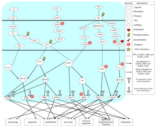 For the next core signaling pathway in Figure 4, the epidermal growth factor receptor (EGFR) receives the microenvironmental factor EGF, and then the signal is transmitted through the transduction proteins via the mutated PIK3CA, DFNA5, CDC37, and the phosphorylated AKT1 to TF ETS1, in which AKT1 is related to apoptosis []. It is found that AKT1 will phosphorylate AKT and inhibit apoptosis. ETS1 is a TF related to maintaining the proliferation of DLBCL and regulating the differentiation of germinal centers []. The overexpression of ETS1 will cause proliferation, survival and differentiation of lymphoma cells []. Modified by phosphorylation, the TF ETS1 will promote the expression of MIR15A and MIR497; meanwhile, ETS1 will upregulate the target gene FGF2. Furthermore, MIR497 will inhibit CCND1 and WNT7A. It is known that WNT7A will promote cell proliferation and metastasis []. MIR15A will inhibit CCND1 and ACTB. Although CCND1 is inhibited by MIR15A and MIR497, CCND1 is upregulated by another TF like NFκB1 as well. Hence, the total expression of CCND1 in DLBCL is still upregulated, leading to subsequent cell proliferation and metastasis. In addition, FGF2 can cause the inhibition of autophagy []. Autophagy is an orderly cell degradation and recycling process in all eukaryotes. There are generally three different forms of autophagy, including microautophagy, macroautophagy, and chaperone-mediated autophagy (CMA) []. One of their functions is to transport the cargo to the lysosome for degradation and recycling. FGF2 will also promote cell proliferation and epithelial-mesenchymal transition (EMT). Therefore, this corresponding core signaling pathway will cause cell proliferation; simultaneously, autophagy and apoptosis will be inhibited, which further promote cancer cell metastasis and EMT in DLBCL. Moreover, the formation process of EMT will destroy the adhesion between normal cells improving the ability of migration and invasion for the cancer cells. It brings benefit to the cancer metastasis. This process not only accelerates the spread of cancer cells but also makes cancer cells spread intensely [].