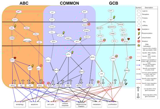Firstly, by big database mining, we constructed a candidate genome-wide genetic and epigenetic network (GWGEN), which is represented by a Boolean matrix (i.e., 0 or 1 if interaction is nonexistent or existent between two nodes). It is noted that both DLBCL ABC and DLBCL GCB shared the same candidate GWGEN. The candidate GWGEN consists of the candidate protein–protein interaction network (PPIN) and candidate gene regulatory network (GRN). For the candidate PPIN, we refer to the following database: DIP [], IntAct [], BioGRID [], BIND [], and MINT []. To the candidate GRN, we collect the pairs of transcription factors and target genes from ITFP [] and HTRIdb []. Moreover, we look up databases including TargetScan [], CircuitsDB [], and StarBase2.0 [] for the post-transcriptional regulations between miRNA, lncRNA and their target genes. After conducting system modeling for proteins, genes, miRNAs, and lncRNAs, we could evaluate system models’ parameters by the system identification method with the help of microarray dataset in two subtypes of DLBCL. There might be false-positive interactions in the candidate GWGEN caused by various experimental conditions. Therefore, we performed a system order detection approach to prune these false-positive interactions for obtaining real GWGENs for DLBCL ABC and DLBCL GCB, respectively (Figures S1 and S2). The total number of nodes (i.e., transcription factors, receptors, proteins, miRNAs, lncRNAs) and their corresponding edges in the candidate GWGEN, real GWGEN of DLBCL ABC, and real GWGEN of DLBCL GCB are shown in Table S1. However, the real GWGENs were still too complicated to analyze. Applying principal network projection (PNP) method, from the real GWGENs, we could extract core GWGENs (Figures S3 and S4), which is comprised of the top 3000 nodes based on the descending order of projection value. The higher the projection value is, the more contribution provided by the node in the real GWGEN. Additionally, we did gene enrichment analyses by the Database for Annotation, Visualization and Integrated Discovery (DAVID) Bioinformatics Resources version 6.8 based on the genes in core GWGENs (Tables S2 and S3). Projecting the corresponding core GWGENs in the annotation of Kyoto Encyclopedia of Genes and Genomes (KEGG), we could further investigate the common and specific pathogenic molecular mechanisms and identify essential biomarkers as drug targets.
