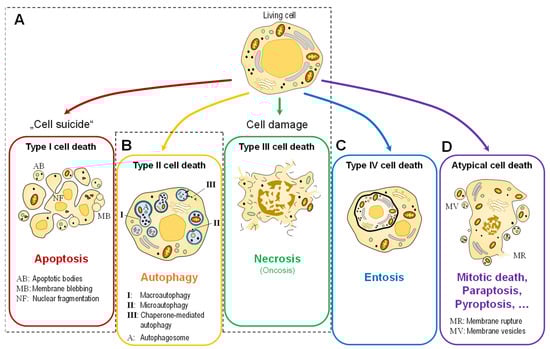 Simplified representation of the morphologically distinguishable types of cell death. (A) The two classical main types, apoptosis (type I) and necrosis (type III). Recent research also distinguishes between two further types: (B) autophagic cell death (type II) and (C) entosis (type IV). (D) Other (molecular) types are grouped under the term “atypical cell death”.