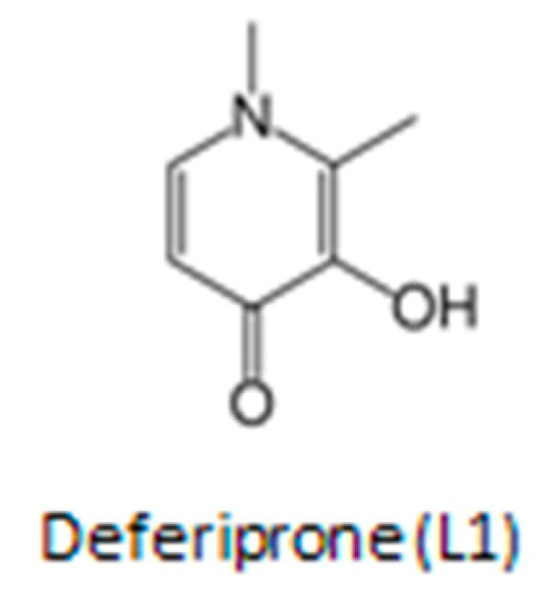 Deferiprone is an EMA- and FDA-approved drug, which is listed by the WHO as one of the essential medicines (Figure 1). It has been used for more than 25 years by hundreds of thousands of patients worldwide for the treatment of transfusional iron overload in thalassemia and other conditions [32,33,34,38]. The general molecular characteristics, mechanisms of chelation, antioxidant, pharmacological, toxicological and other properties of L1 have been previously reviewed [32,33,34,38,39]. Deferiprone is an orally active, low molecular weight hydrophilic drug, which is on the top of the list of drugs with the highest safety record per dose and frequency of administration. It has been used in many non-iron loaded categories of patients in addition to iron overload categories with no significant toxicity [32,33,34,38,39]. Deferiprone can diffuse through almost all major organs where it can exert effectively its antiviral, antioxidant and other therapeutic effects [33,34,38,39].