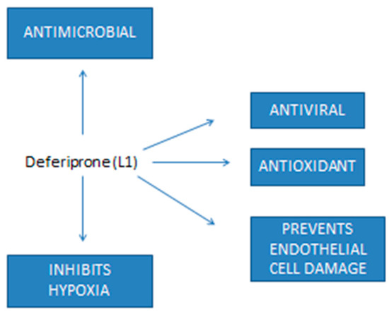 Iron chelating drugs and in particular L1 have been identified to fulfill many of the requirements of a multi-target therapeutic against COVID-19 and diseases with similar symptomatology (Figure 1). In particular, the antiviral properties of L1 in different viral species and encouraging clinical results in HIV patients support its further evaluation in other viral diseases including its clinical effects against SARS-CoV-2 growth and proliferation. Similarly, L1 has been shown to be effective against many of the side effects of COVID-19 including hypoxia, endothelial cell damage, microbial infections and sepsis. Studies do not support an increase in microbial growth or infection in patients treated with parenteral or enteral iron, and the other potential benefits of iron chelation in the treatment of COVID-19 and other microbial diseases are also encouraging. Furthermore, L1 has been shown to be one of the most potent antioxidant drugs in many in vitro, in vivo and clinical models, supporting its introduction for treatment in many categories of patients with no available effective treatments, such as neurodegenerative diseases and cancer.
