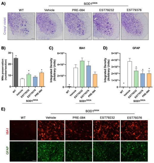 2.5. EST79232 Treatment Protects Spinal MNs and Reduces Astroglial Activation in SOD1G93A Mice