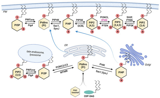 Biosynthesis of PtdInsPs in mammalian cells. The primary locations of the inositol lipids are shown along with the most common interconversions and converting enzymes. Blue arrows indicate the direction of lipid transport from one membrane compartment to another; black arrows indicate forward and reverse reactions. Note that PtdIns, the precursor to the PtdInsPs, is formed from myo-inositol and CDP-DAG at the ER (see text). ER: endoplasmic reticulum; CDP-DAG: cytidine diphosphate diacylglycerol; PIKFYVE: phosphoinositide kinase, FYVE-type zinc finger containing; FIG4: FIG4 phosphoinositide 5-phosphatase; PIP4K: phosphatidylinositol-5-phosphate 4-kinase; SAC1: SAC1 Like phosphatidylinositide phosphatase; SynJ: synaptojanin 1; PIP5K: phosphatidylinositol-4-phosphate 5-kinase; OCRL: OCRL inositol polyphosphate-5-phosphatase; PI3KC1: class I phosphatidylinositol 3-kinase; PTEN: phosphatase and tensin homolog; SHIP: SH2 domain-containing inositol 5′-phosphatase 1; PI3KC2/C3: class 2/class 3 phosphoinositide 3-kinase; MTMR: myotubularin-related protein/phosphatidylinositol-3-phosphatase. Created with BioRender.com, accessed on 27 May 2022.