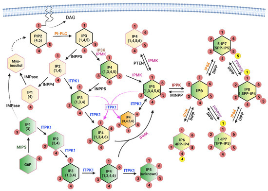 Biosynthesis of InsPs and PP-InsPs in mammalian cells. Lipid-derived precursors originate from PtdIns(4,5)P2 and are shown in yellow; glucose-derived precursors originate from G6P and are shown in green. Stereoisomers that can originate from both sources are shown as dual colors. InsP4(3,4,5,6) is highlighted in orange due to its unique function as an ion channel regulator (see text). Bold black outlines highlight the dominant synthetic pathways in humans. Forward and reverse reactions are indicated with black arrows; only the reverse reactions proposed to commonly occur are indicated. Magenta arrows indicate ITPK1 phosphotransferase reaction. The dashed arrow from myo-inositol to PIP2 refers to a multistep reaction. Kinases are color-coded to aid in visualization due to substrate promiscuity. Phosphatases are shown in black. PI-PLC: phosphatidylinositol specific phospholipase C; IP3K: inositol-trisphosphate 3-kinase; IPMK: inositol polyphosphate multikinase; ITPK1: inositol-tetrakisphosphate 1-kinase; IPPK: inositol-pentakisphosphate 2-kinase; IP6K: inositol hexakisphosphate kinase; PPIP5K: diphosphoinositol pentakisphosphate kinase; MIPS: myo-inositol 1-phosphate synthase; IMPase: inositol monophosphatase; INPP4/INPP5: inositol polyphosphate-4-phosphatase/inositol polyphosphate-5-phosphatase. Created with BioRender.com, accessed on 27 May 2022.