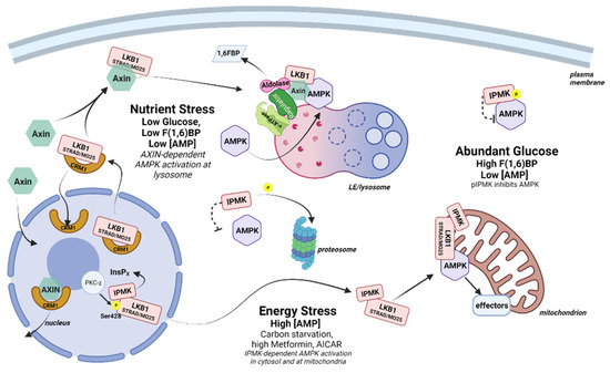 AMPK has been described as existing in three spatially distinct pools that are hierarchically activated based on the degree of cellular and/or energy stress—lysosomal, cytosolic, and mitochondrial (Figure 3). The lysosomal pool of AMPK responds to low glucose, while the cytosolic and the mitochondrial pools are activated by moderate (<60 µM) and high (>60 µM) concentrations of AMP [74]. Based on this model, under low glucose conditions, lysosome-associated aldolase releases bound fructose(1,6)bisphosphate (F(1,6)BP—a glycolytic metabolite), resulting in a conformational change that promotes the docking of LKB1 and the activation of AMPK in an AXIN-dependent, AMP-independent manner. During moderately severe or prolonged nutrient stress (e.g., >16 h of fasting in mice) a cytosolic pool of AMPK is activated in an AXIN-dependent, aldolase-independent manner. Finally, under extreme stress, an additional pool of AMPK associated with mitochondria becomes activated in an AXIN-independent manner.