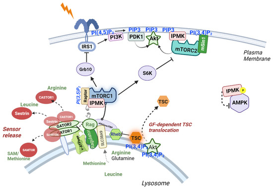 Regulation of mTORC1 and mTORC2 by IPMK and PtdInsPs. A representation of the inositol phosphate components that interact with mTORC1 at the lysosome, including PI(3,4)P2 recruitment of Akt to inactive TSC and PI(3,5)P2 interaction with RAPTOR for membrane association, and IPMK interaction to stabilize mTORC1 association with the RAG GTPase proteins at the Ragulator complex. Binding of arginine and leucine to the amino acid sensors CASTOR1 and Sestrin cause them to release from the lysosomal surface, providing room for mTORC1 to dock with RAG proteins for activation by RHEB. Separately, mTORC2 interacting with IPMK associates with PI(3,4)P2 through the mSin1 PH domain, while IPMK produces PI(3,4,5)P3 for the activation of Akt and PDK1. Activation of the insulin receptor (represented by a lightning bolt) also stimulates PI3K to produce PIP3 for PDK1 and Akt activation. Under these nutrient-rich conditions, a pool of cytosolic IPMK binds and prevents the activation of AMPK. Created with BioRender.com, accessed on 27 May 2022.