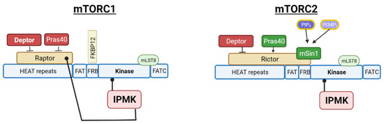 Diagram of mTORC1 and mTORC2 interactions with IPMK. Schematic diagrams of the mTOR kinase regions with key components of the mTORC1 and mTORC2 complexes. Physical associations of IPMK N-terminus with the mTOR kinase domain and the C-terminus of IPMK with Raptor are indicated by black lines. Created with BioRender.com, accessed on 27 May 2022.