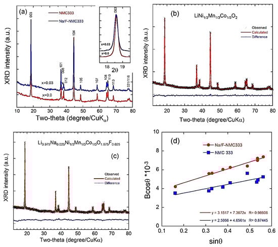 (a) XRD patterns of NMC333 and Na/F-NMC333 obtained from X-ray radiation with a photon wavelength of 1.54056 Å. Rietveld refinements of X-ray diffractograms for: (b) pristine NMC333 and (c) Na/F-NMC333. (d) Analysis of the microstrain from the broadening of Bragg reflections according to Equation (1).