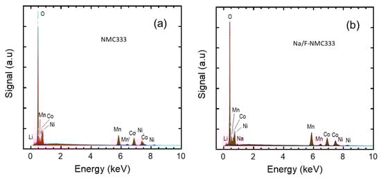 SEM–EDS spectra of: (a) pristine LiNi1/3Mn1/3Co1/3O2 and (b) Na/F co-doped Li1-zNazNi1/3Mn1/3Co1/3O2-zFz (z = 0.025).