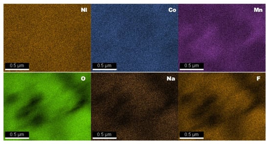 The elemental compositions of the pristine NMC333 and co-doped Na/F-NMC333 samples were determined using an energy-dispersive X-ray spectrometer attached to the SEM apparatus (SEM–EDS). The SEM–ESD analyses are depicted in Figure 2. Due to the very low content of fluorine and the vicinity of its Kα peak at 0.677 keV, the signal is mingled with the stronger Lα peak of Mn at 0.637 keV. The EDS spectra indicate that the compositions of the samples are in agreement with the nominal formula (see results in Table 2). In the co-doped Na/F-NMC333 sample, the sodium and fluorine molar fractions are 0.028 and 0.026, respectively, which match well with the nominal composition (z = 0.025). Note that the co-doped material contains less Ni2+ cations than the pristine sample. Figure 3 displays the elemental mapping of the Na/F-NMC333 sample. Ni, Co, and Mn are uniformly distributed in both samples. The Na and F elements are almost homogeneously distributed, although some Na- and F-rich regions can be observed. This feature results from the mixing method, which is very difficult to handle for a uniform atomic spatial distribution [].