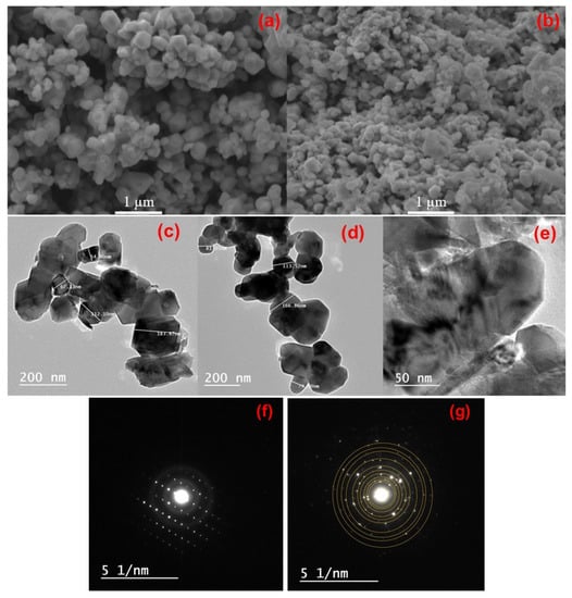 The morphology of the as-prepared samples was investigated through scanning and transmission electron microscopies. The SEM and TEM images of the NMC333 and Na/F-NMC333 samples shown in Figure 4a–d, respectively, display the typical morphology of nanostructured particles (submicron in size) synthesized by the sol–gel method. This technique, using EDTA as a chelating agent, can effectively control a homogeneous particle size distribution. The SEM images reveal the regular polygon shape of the nanoparticles. At the same time, the introduction of dopants into the NMC333 network maintains a uniform distribution of the particles, with a small decrease in the average nanoparticle size. The faceted nanoparticles remain unaltered with co-doping. The TEM images for NMC333 and Na/F-NMC333, displayed in Figure 4c,d, respectively, confirm the above observations. The TEM patterns (200 nm scale) do not show a significant difference in the particle shape upon co-doping in the NCM333 layered framework. The nanoparticles appear well-faceted, and the average particle sizes were found to be 135 nm for pristine NMC333, and 121 nm for co-doped Na/F-NMC333. Figure 4e displays the HRTEM image of Na/F-NMC333 (50 nm scale), in which no LiF or NaF coating was detected at a very low F loading (z = 0.025). This lack of surface coating is consistent with previous reports [,]. In addition, several papers mention that F substitution reduces LiF formation in the CEI layer, which enhances the Li-ion transfer at the electrolyte/electrode interface. In contrast, the existence of a LiF surface layer substantially alters the ionic transfer, which is due to its poor Li-ion conductivity [].
