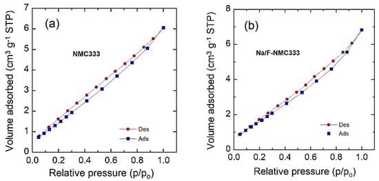 BET experiments showing N2 adsorption–desorption isotherms of: (a) pristine NMC333 and (b) Na/F-NMC333 samples.