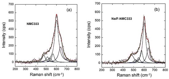 Raman spectroscopy was also applied to investigate the structural properties because this technique is sensitive to the short-range environment of oxygen coordination around the cations in oxide frameworks. The Raman active modes of the layered oxide LiMO2 (M = Ni, Mn, and Co) substantiate the XRD results, as they are less affected by the grain size. They correspond to vibrations that primarily involve the atomic motion of cations against their oxygen neighbors. Consequently, these modes are very sensitive to the cationic local environment in the rhombohedral crystal lattice []. Layered LiMO2 (M = Ni, Mn, or Co) compounds have the spectroscopic D3d5 symmetry, in which the representation of the vibration modes associated to each transition-metal ion are as follows: Γ = 2A2u + 2E2u + A1g + Eg. Only the A1g and Eg are Raman active modes, and they originate from the M–O stretching and O–M–O bending modes, respectively. In the present study, the compound has three M ions (M = Ni + Mn + Co). Therefore, as illustrated in Figure 6a,b, the three A1g and Eg modes overlap to give two broad bands that are centered at approximately 480 and 600 cm−1. The best fit to the Raman spectra is achieved starting from a prescribed set of three individual bands of Lorentzian shape for the overlapping band profiles. Table 4 lists the different spectral parameters (position, width, and area) of the deconvoluted bands. They match well with those of the individual compounds: LiNiO2, LiCoO2, and LiMnO2 []. Conversely, the bandwidths of the ν1 and ν2 Ni-type vibrations for the NMC333 sample are slightly larger than those of Na/F-NMC333. A possible explanation for the broadening of the Raman bands for Ni-containing compounds is the NiLi antisite defect (Ni on the Li site). This is more evidence of the larger Ni/Li cationic disorder in this pristine sample.