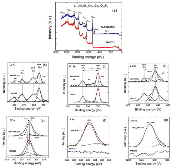 XPS results for the NMC333 and Na/F-NMC333 samples: (a) survey spectra and (b–g) high-resolution spectra. (b) Ni 2p, (c) Co 2p, (d) Mn 2p, (e) O1s, (f) F1s, and (g) Na1s core levels.