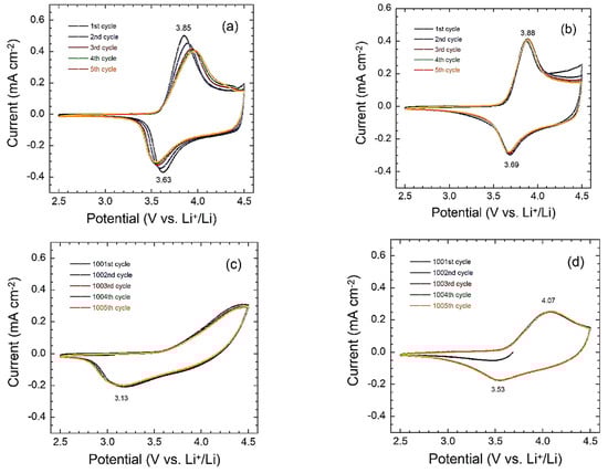 Cyclic voltammograms of lithium-ion battery cells with: (a,c) NMC333 and (b,d) Na/F-NMC333 positive electrodes in the potential range of 2.5–4.5 V vs. Li+/Li0 at a 0.02 mV s−1 scan rate. (a,b) Fresh cells and (c,d) cells after 1000 cycles at a 1C rate.