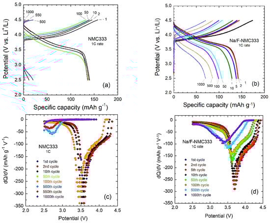 Galvanostatic charge–discharge profiles at typical cycles (1st, 2nd, 5th, 10th, 50th, 100th, 500th, and 1000th) of: (a) pristine NMC333 and (b) co-doped Na/F-NMC333, cycled at a 1C rate in the voltage range of 2.5–4.5 V. The corresponding derivative (dQ/dV) vs. voltage plots for (c) NMC333 and (d) co-doped Na/F-NMC333.