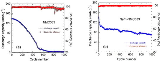 Specific discharge capacities and Coulombic efficiencies for electrodes tested at 1C over 1000 cycles in the voltage range of 2.5–4.5 V: (a) pristine NMC333 and (b) co-doped Na/F-NMC333.