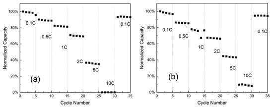 Rate capabilities for: (a) pristine NMC333 and (b) co-doped Na/F-NMC333 at various C-rates in the range of 0.1C–10C. For both electrodes, the capacity is normalized relative to the first discharge capacity at a 0.1C rate.