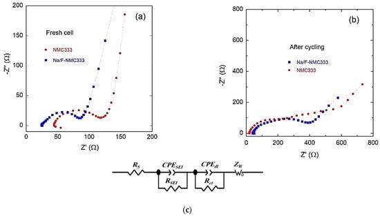 EIS measurements of NMC333 and Na/F-NMC333 electrodes. Nyquist plot of: (a) fresh electrodes and (b) electrodes after cycling at 1C rate. (c) Equivalent circuit used for the analysis of the -Z” vs. Z’ planes.