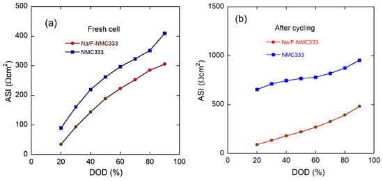 Figure 13a,b displays the variation in the ASI for the NMC333 and Na/F-NMC333 electrodes before and after 1000 cycles at a 1C rate, respectively. At 90% DOD, the ASI values at the first cycle are 360 and 305 Ω cm2, and they increase to 696 and 482 Ω cm2 after long-life cycling (1000 cycles) for NMC333 and Na/F-NMC333, respectively. These results indicate that the charge-transfer resistance is dependent on the DOD, as well as the aging of the electrode. In addition, at the 1000th cycle, the rate of increase in the ASI values for the pristine NMC333 is much higher than that observed for the doped Na/F-NMC333. As is seen in Figure 13b, the ASI value at 20% DOD for the fresh NMC333 electrode is about 56 Ω, which increased to 409 Ω after 1000 cycles. This increase is smaller in the case of Na/F-NMC333, as the ASI value increased only slightly from 35 to 90 Ω. This confirms that Na/F doping may not only inhibit the rock-salt formation on the surface to form a more stable SEI film during cycles [], but also cause a decrease in the charge-transfer resistance and facilitate ion and electron transfer during the charge–discharge process. This reduction in the ASI values, and, hence, increase in the Li-ion diffusion, may be attributed to the observed larger interslab spacing distance (i.e., LiO2 (ILiO2)), which favors Li-ion diffusion. These results agree well with those reported by Belharouak et al. [] for the LiNi1/3Co1/3Mn1/3O2 electrode, and by Oh et al. [] for Li[Ni0.5Mn0.5]1-xCoxO2.