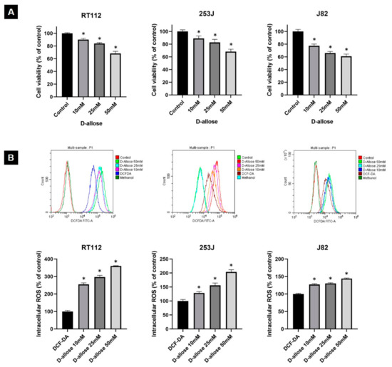 D-allose inhibits cell viability and induces intracellular reactive oxygen species (ROS) in three bladder cancer cell lines. (A) An MTT assay reveals that treatment with varying concentrations of D-allose for 24 h inhibits the cell viability of RT112, 253J, and J82 bladder cancer cell lines. Statistically significant (p < 0.05) decreases in cell viability rates compared with the control (set at 100%) are represented by asterisks (*). (B) The 2′,7′-dichlorofluorescindiacetate (DCF-DA) fluorescence-activated cell sorting (FACS) analysis revealed that treatment with varying concentrations of D-allose for 1 h induced intracellular ROS production in RT112, 253J, and J82 bladder cancer cell lines. Statistically significant (p < 0.05) increases in intracellular ROS levels compared with the control (DCF-DA; set at 100%) are represented by asterisks (*).
