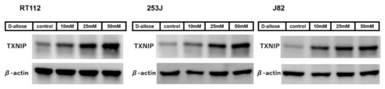 The fluorescence-activated cell sorting (FACS) analysis showed a significant dose-dependent increase in intracellular ROS levels following D-allose treatment in all three BC cell lines (Figure 1B). After 1 h of 50 mM D-allose treatment, the intracellular ROS levels were increased by 360.2 ± 1.7, 203.8 ± 7.9, and 144 ± 1.8% in RT112, 253J, and J82, respectively, compared with the controls (p < 0.0001, p = 0.0004, and p < 0.0001, respectively). Western blotting revealed that D-allose stimulated TXNIP expression in all three BC cell lines in a dose-dependent manner (Figure 2).