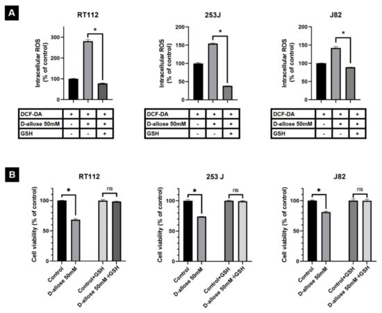 In addition, we evaluated the effects of D-allose, with and without the antioxidant GSH, on cell viability using the MTT assay. After 24 h of incubation, the BC cells (RT112, 253J, and J82) were treated with 50 mM D-allose, with and without 5 mM GSH, for 24 h. Cell viability was analyzed as described above.