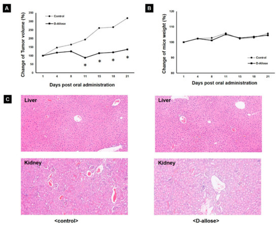 Orally administered D-allose inhibited tumor growth in a preclinical mouse model. There was a significant difference in tumor volumes between D-allose-treated mice and normal saline-treated mice after a 15-day treatment period (Figure 4A; p < 0.05). Histological findings in tumor tissues showed that D-allose decreased the number of cancer cells with nuclear fission from 4.1 to 1.1% (p = 0.004). In addition, D-allose did not affect body weight (Figure 4B). Furthermore, there were no differences in the histological findings of the kidney and liver tissues between mice treated with oral D-allose and those treated with normal saline (Figure 4C).