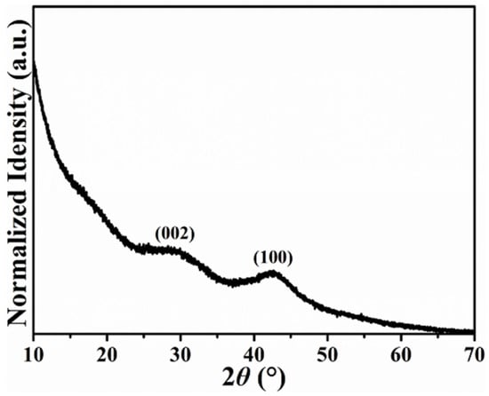 To explore the physicochemical and morphological properties of H@H composite material, it was systematically investigated by PXRD, Raman, SEM, TEM, BET, EA, and XPS, with the corresponding characteristics compared with those of H-HPAC. Figure 1 depicts the normalized PXRD pattern of H@H to show its crystalline structure. As can be seen, only two broad peaks, assigned to the (002) and (100) planes of carbon (JCPDS No.: 41-1487), were reflected, which was consistent with the original H-HPAC and other activated carbon materials [9,14,17,20,22]. In line with the possible formation mechanism for PVP hydrogel proposed in our previous study, the cross-linking reactions among the polymer chains were initiated by the coordination between potassium cations (K+) and oxygen anions (O−) [9]. When the K2CO3 solution was added to the PVP/H-HPAC solution, it is reasonably postulated that the K+ would also interact with the H-HPAC because 4.7% of the oxygen present in the original H-HPAC was verified by elemental analysis [9]. If so, the K+ coordination among the H-HPAC would be covered by the PVP hydrogel. Even so, no peaks associated with unreacted K2CO3 were observed from the PXRD pattern, implying that the purity of H@H was not affected by the presence of H-HPAC after thoroughly rinsing with DI water.