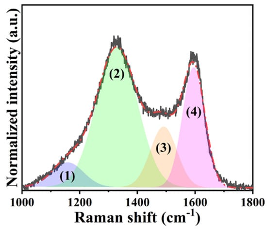 Raman characterization is another approach that can directly examine the crystallinity of carbonaceous materials. The normalized Raman spectrum illustrated in Figure 2 shows two distinct peaks representing the D (~1327 cm−1) and G (~1593 cm−1) bands. Besides, it is meaningful to discuss the intensity ratio between D and G bands (ID/IG) because the degree of defects within the carbonaceous materials can be further evaluated. The value calculated from the H@H was 1.16, the same as the H-HPAC and close to that of the A-PVP-NC (1.18) [21]. The high ID/IG ratio suggests that many defects and/or highly disordered degrees exist, as is generally observed in the carbonaceous materials with numerous functional groups [23,24]. Consequently, we could ascribe this result to the presence of heteroatoms (i.e., N and O) and lower crystallinity, as demonstrated in the original H-HPAC [9]. On the other hand, the corresponding Raman spectrum was sequentially deconvoluted into four peaks (labeled peaks (1)–(4)) since the integrated area ratio of sp3 to sp2 (Asp3/Asp2) has been shown to provide helpful information on the nature of carbon, e.g., a low Asp3/Asp2 ratio indicates that a large amount of carbon exists as the sp2 type [25,26]. Among them, peaks (2) and (4) are associated with sp2-type carbon, whereas the others are related to sp3-type carbon [27]. The integrated area ratio of sp3 to sp2 (Asp3 / Asp2) was calculated to be 0.28, which was identical to that of H-HPAC [9]. This result signifies that the H@H still retained a high proportion of sp2-type carbons, even with intrinsically lower crystallinity.