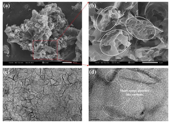 To examine the morphological features of H@H, micrographs were captured using SEM and TEM. The hierarchically porous architectures constructed by interconnected carbonaceous frameworks were clearly visible from the low-magnification SEM micrographs in Figure 3a,b. It is worth mentioning that rough surfaces with numerous voids were found, as indicated by white circles in Figure 3b. The diverse porous configurations are reasonably attributed to the water molecules encapsulating within PVP/H-HPAC hydrogel being evaporated and the activation process by interacting the carbonized residues with K2CO3 under 900 °C (i.e., K2CO3 + 2C → 2K + 3CO, K2CO3 → K2O + CO2, C + CO2 → 2CO) [18,19]. Based on the morphologies found in SEM, it is expected that similar characteristics were also exhibited, as shown in Figure S2 and Figure 3c at different TEM magnifications. Moreover, it is seen that the short-range disorders, such as carbon lattices, highlighted by white circles were displayed in Figure 3d, which might be correlated with skeleton collapse after high-temperature pyrolysis [28].