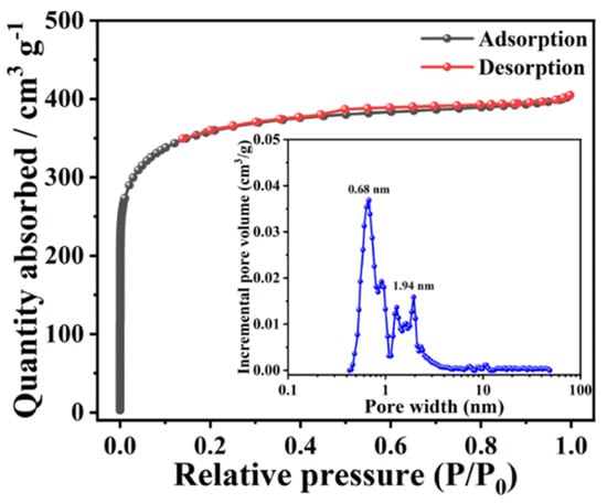 Given the positive results found in SEM and TEM, it is believed that the textural characteristics of H@H would not be significantly affected. To accurately classify pores and determine the specific surface area (SSA), the nitrogen adsorption–desorption measurement was conducted, and the corresponding isotherm is shown in Figure 4. As plotted, not only a high volume of nitrogen gases were adsorbed and desorbed at low relative pressure (i.e., Type I isotherm), but also the predominant pore diameter was less than 2 nm (inset of Figure 4), confirming the microporous feature for H@H [9,21,29]. However, all values diminished except for the pore size distributions of ultramicropores as compared with H-HPAC (see Table 1). For instance, the SSA value determined by the Brunauer–Emmett–Teller (BET) method decreased by about 35%. Accordingly, the SSA values contributed by micropores and mesopores were decrease to 1246 m2/g and 45 m2/g, respectively. In particularly, the latter was reduced by even approximately 84%. When preparing the PVP/H-HPAC composite hydrogel, these pores within the H-HPAC would be filled with the viscous PVP solution so that the PVP blocked the original pores after drying of the composite hydrogel at 120 °C. In addition to the issue mentioned above, the decrease in the textural parameters might also be actuated by the possible interaction between H-HPAC and K+. Such a phenomenon is rationally postulated to affect the cross-linking degree of the PVP/H-HPAC composite hydrogel, as shown by the XRD characterization, leading to fewer sites for activation.