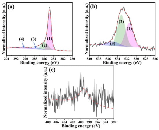 High-resolution XPS spectra of H@H composite material: (a) C 1s ((1) for C=C, (2) for C−O, (3) for C=O, and (4) for O=C−O bonds), (b) O 1s ((1) O=C−O, (2) C=O, and (3) C−O bonds), and (c) N 1s.