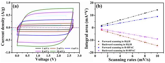 (a) Cyclic voltammograms collected in the voltage range between 0 and 2.7 V at scanning rates from 1 to 10 mV/s and (b) dependence of the integral area on scanning rate, with the values acquired from (a) and Ref. [9] for H@H and H-HPAC, respectively.