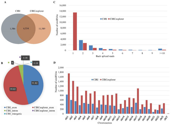 - Cheng, J.; Metge, F.; Dieterich, C. Specific identification and quantification of circular RNAs from sequencing data. Bioinformatics 2016, 32, 1094–1096. [Google Scholar] [CrossRef] [PubMed] [Green Version]