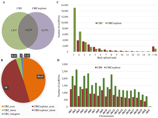 For mouse data, 17,694 circRNAs were identified by CIRI, whereas 31,252 circRNAs were identified by CIRCexplorer. We found a total of 14,279 circRNAs were identified by both the tools, whereas 20,388 circRNAs were identified by a single method (Figure 2A). There were 90.65% (16,040/17,694) exonic, 8.23% (1456/17,694) intronic, and the rest were intergenic circRNAs among the total circRNAs identified by CIRI (Figure 2B). The average number of back-splice reads spanning the circRNAs was ten. Around 77% of the circRNAs were supported by less than or equal to seven back-splice reads. From the chromosome distribution, it was found that the distribution was heterogeneous and the maximum number of circRNAs (1513) were generated from chromosome 2 (chr2) (Figure 2D). Among the circRNAs identified by CIRCexplorer, 98% (30,756/31,252) were exonic and the rest were intronic, and no intergenic circRNAs were found. The average number of back-splice reads was four and about 81% circRNAs were spanned by less than or equal to three back-splice reads. The distribution of circRNAs in different chromosomes was heterogeneous and most circRNAs were in chromosome 2 (chr2). Figure 2 showed the expression profile of circRNAs for mouse data.