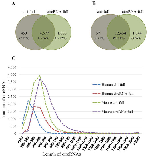 Sequence reconstruction results for circRNA-full and ciri-full. (A) Venn-diagram of the number of reconstructed circRNAs for human data. (B) Venn-diagram of the number of reconstructed circRNAs for the mouse data. (C) Length distribution of reconstructed circRNAs.