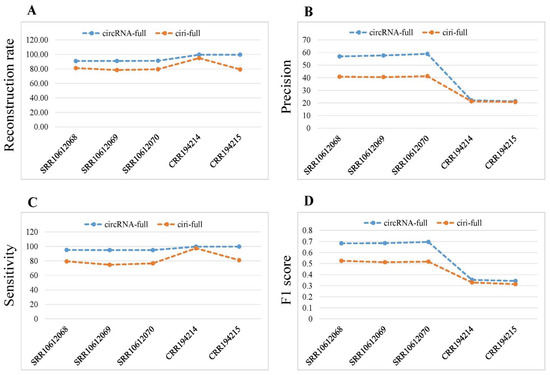 Performance comparison of circRNA-full and ciri-full. (A) Reconstruction rate. (B) Precision. (C) Sensitivity. (D) F1 score for different samples.