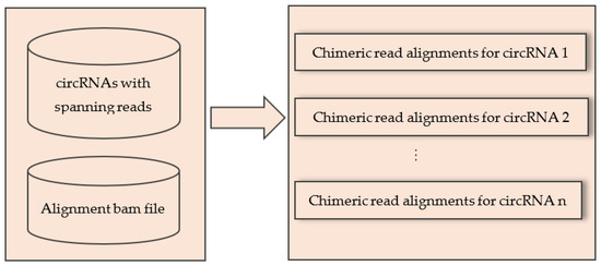 The inputs of this step were: (1) the list of all circRNAs with the name of their spanning reads, and (2) the alignment bam file containing all chimeric reads. Input 1 was a two-column txt file where the first column contained chromosome, start and end position of circRNAs separated by “:” and “|”. The second column contained the list of spanning reads of the circRNAs separated by commas. Input 2 was the standard alignment bam file containing only the chimeric reads. The output of this step generated a separate txt file for each circRNA that contained the alignment of chimeric reads that spanned that circRNA. The pictorial representation of this step was given in Figure 5.