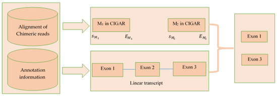 In this step, we extracted exons from the CIGAR value of the chimeric read alignment bam file. We utilized the CIGAR string M and N to extract exons and introns, respectively, where M represented matches in exons and N represented skip elements due to introns. For example, if the alignment start position at and , then the procedure of extracting exons/introns was as follows. Let us define,