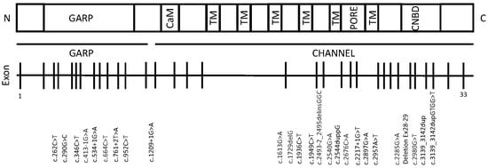 - Peng, C.; Rich, E.D.; Varnum, M.D. Subunit configuration of heteromeric cone cyclic nucleotide-gated channels. Neuron 2004, 42, 401–410. [Google Scholar] [CrossRef] [Green Version]